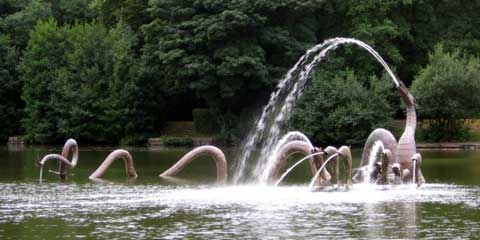 Above the town there is a large man-made lake popular for fishing and, in recent years, model boating. In the centre of the lake is a striking sculpture of a water serpent and leaping carp, the scales of which are made of thousands of copper plates initialled by local people and visitors during construction of the work during 2005. Beside the lake a distinctive tree-trunk sculpture known as the Llandoddy has been carved "to create a corporate image ... to attract tourists and provide the town with a strong identity for people to rally round."